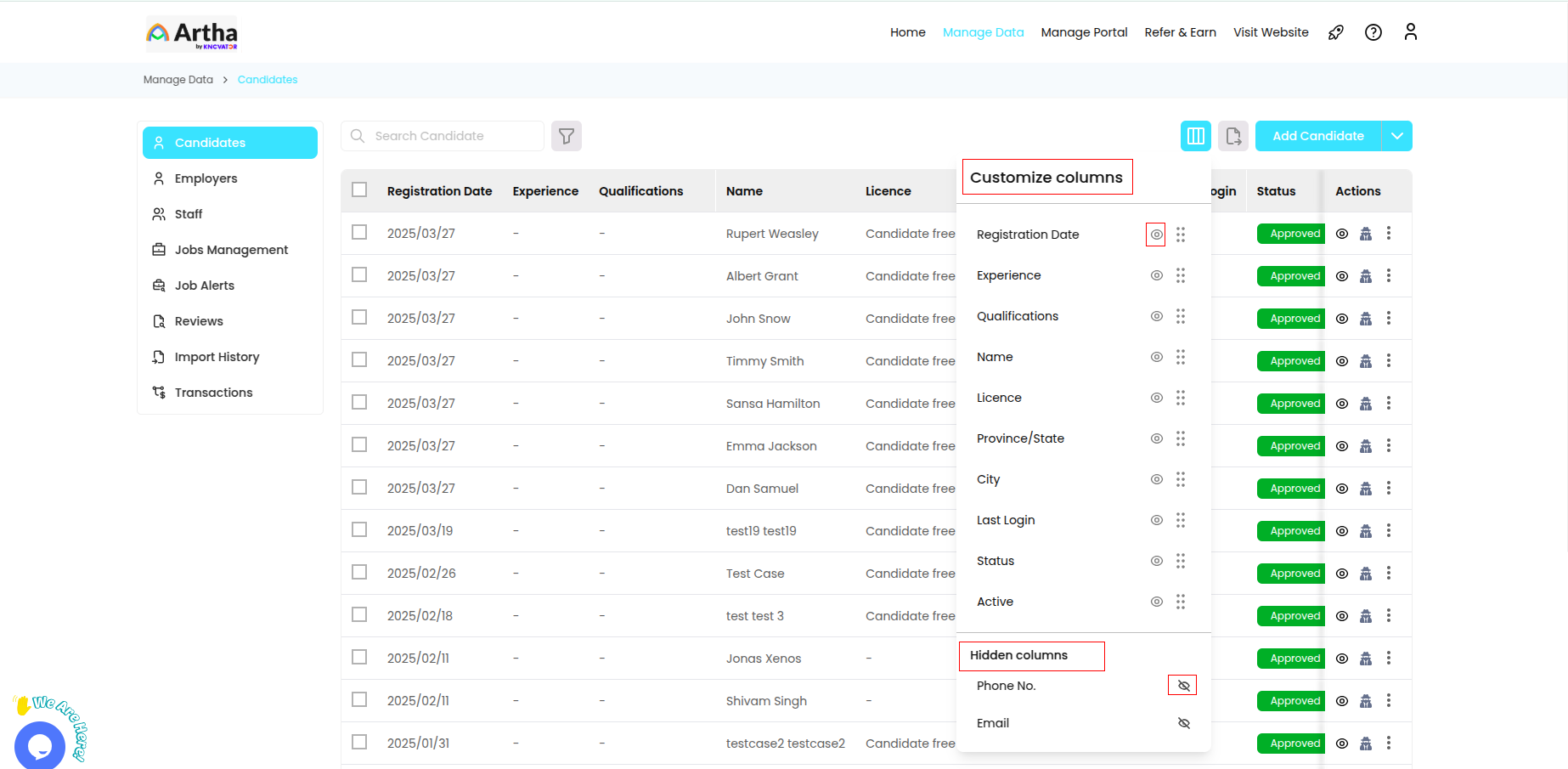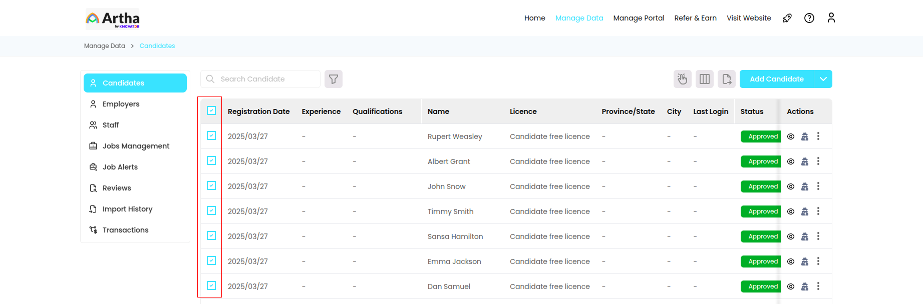 In the "Manage Data" module, this is the first section you can see from where you can manage and manipulate the candidate details registered on the platform to seek a job.
