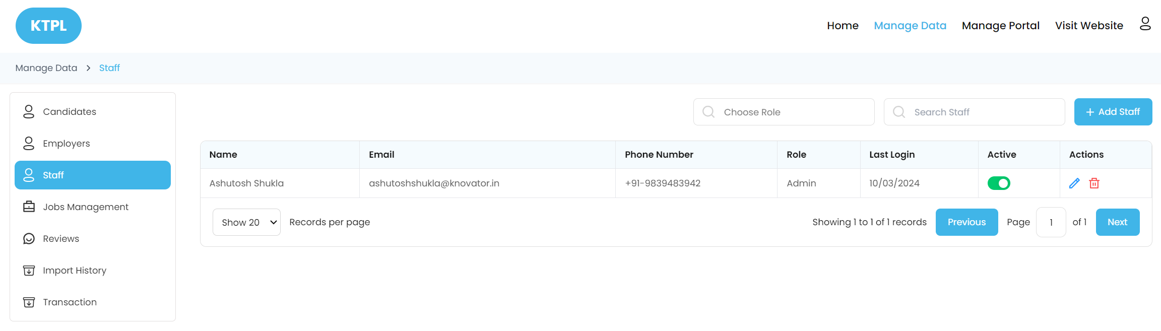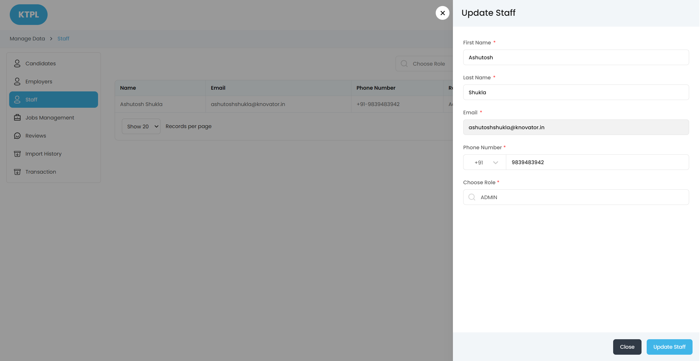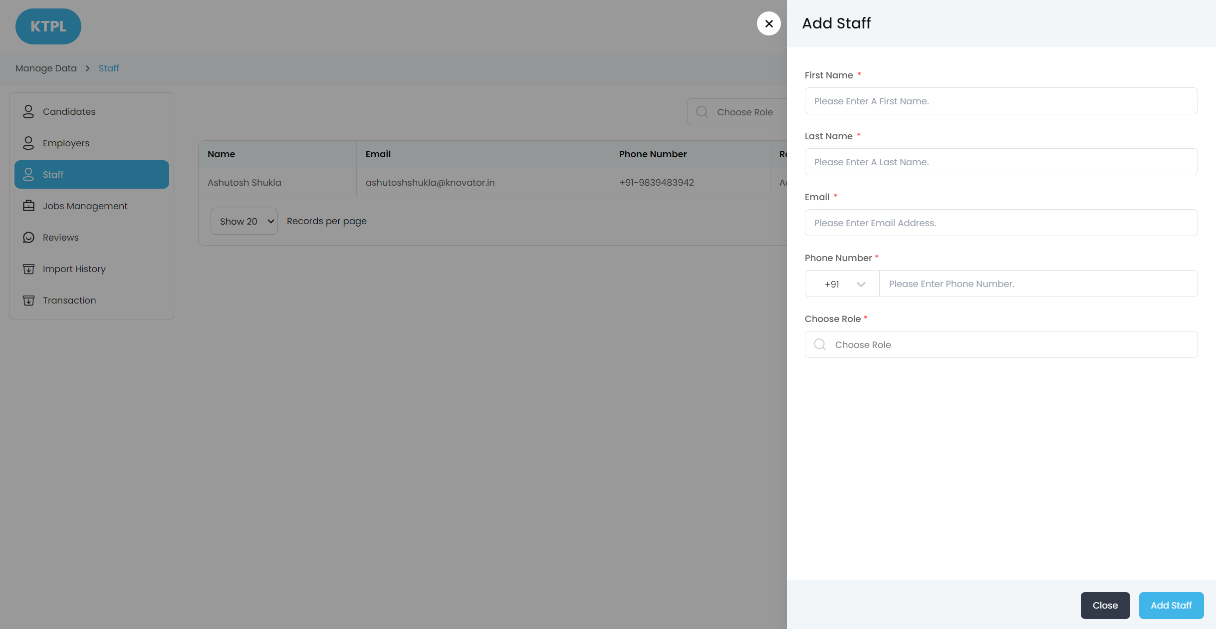 The admin can add and manage the Staff from the Admin Panel.