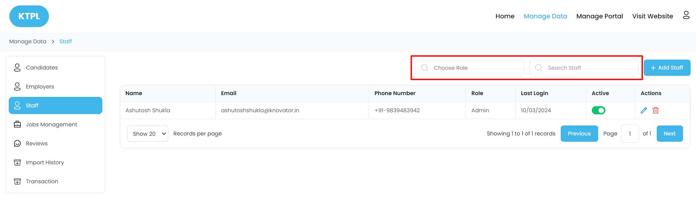 1. **Choose Role:** This feature works like a filter, if the admin selects any particular role he/she will get the list of Staff with that same role.