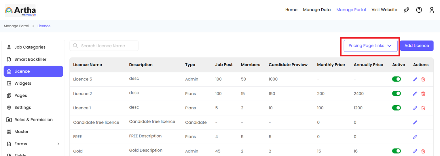 An Admin has access to add and manage the Licence from an Admin Panel which will be used by an Employer based on their subscription plan.