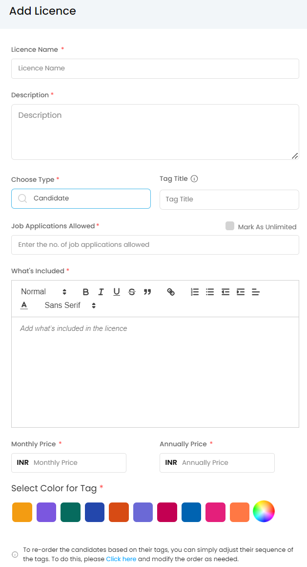 7. **Select Color for Tag:** This selection will apply the colour on the tag that will be visible to the candidate's profile after purchasing a licence.