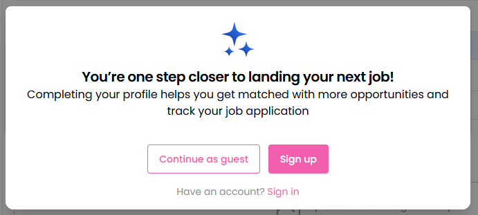 6. After applying for the job, the guest candidate is prompted to "Continue as a Guest" or "Sign Up".\ <br>