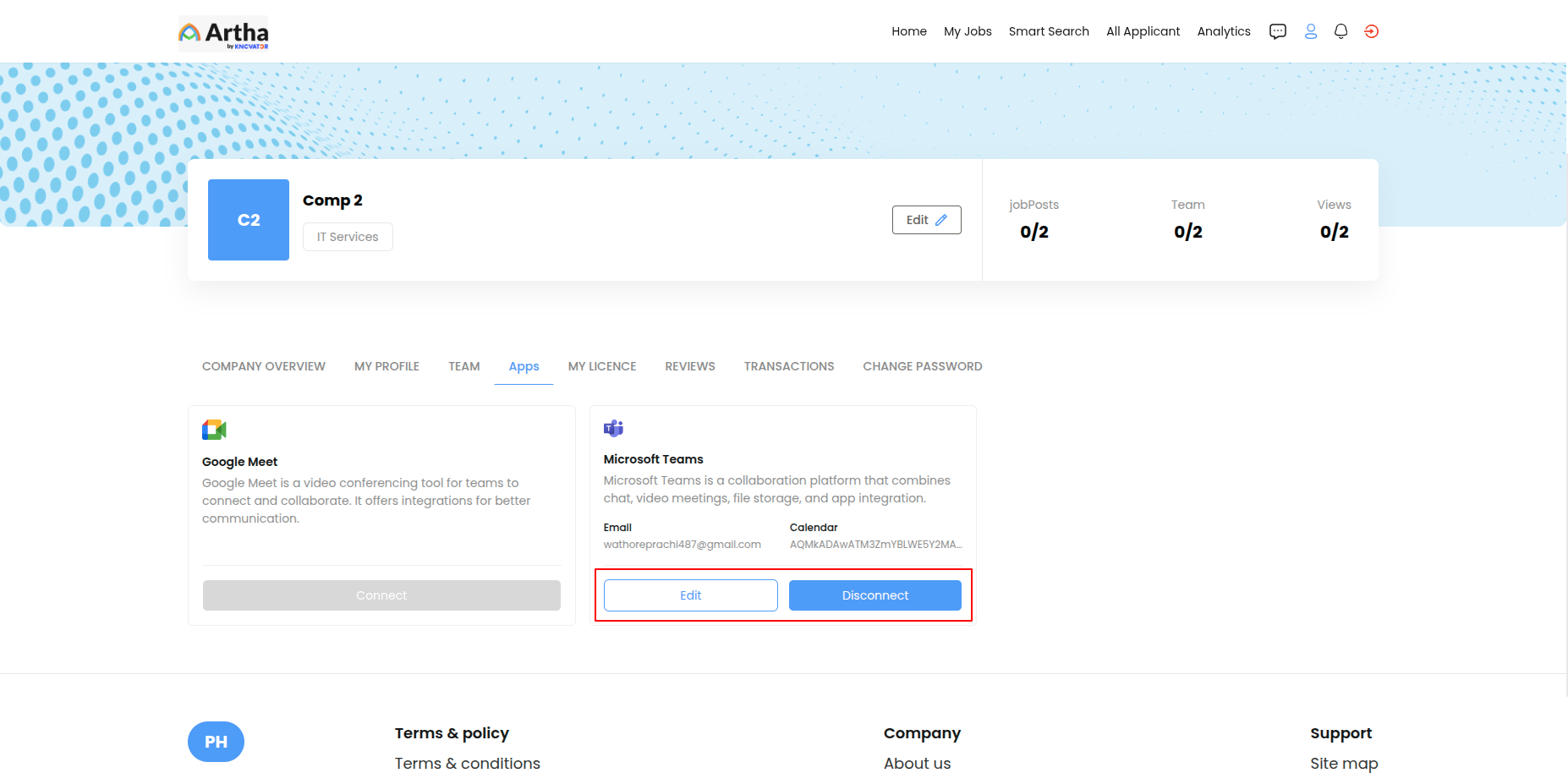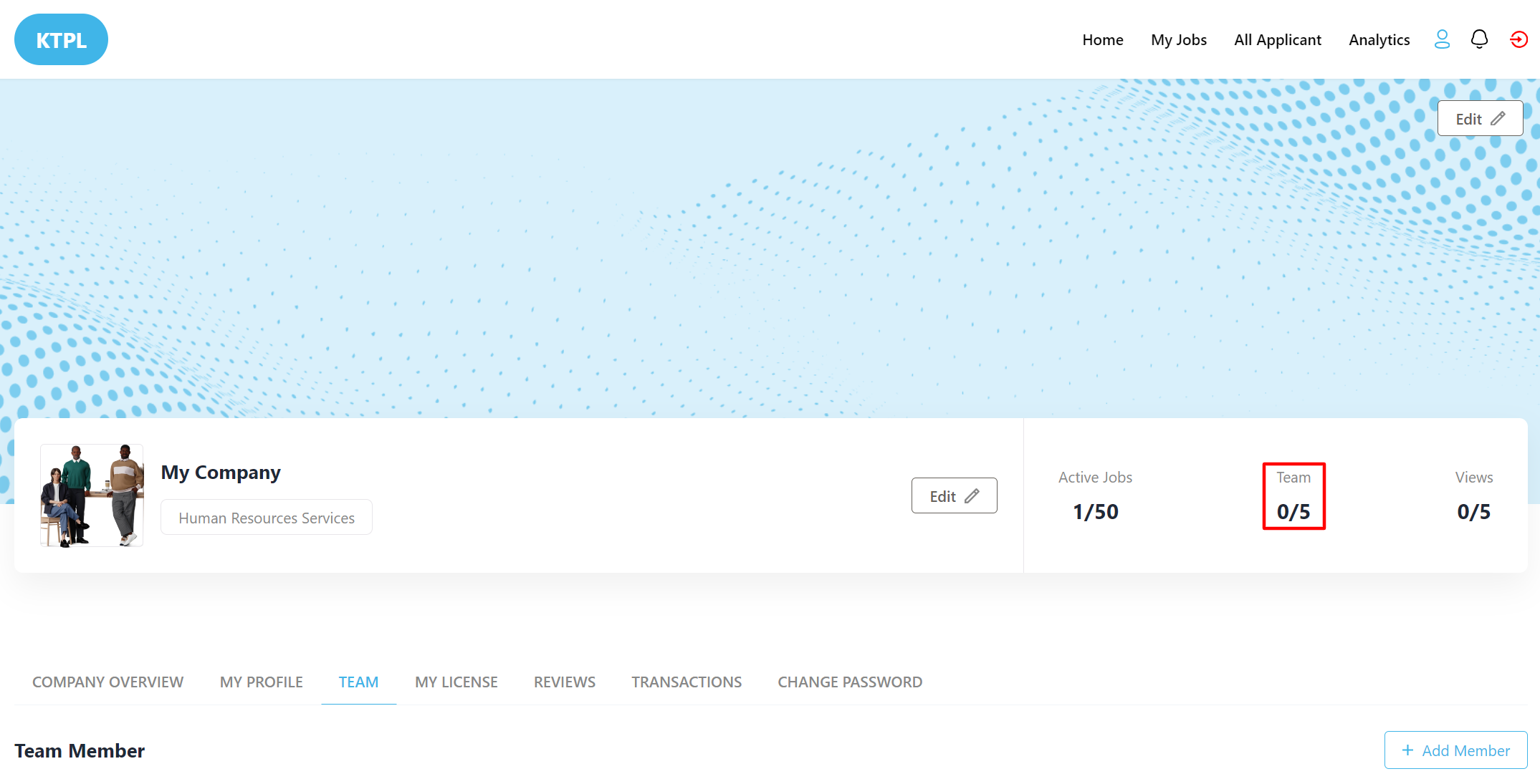 2. **Team :** This count represents the Team members added by an employer upon the Total Team Members allowed the employer is allowed to add based on the Licence criteria.