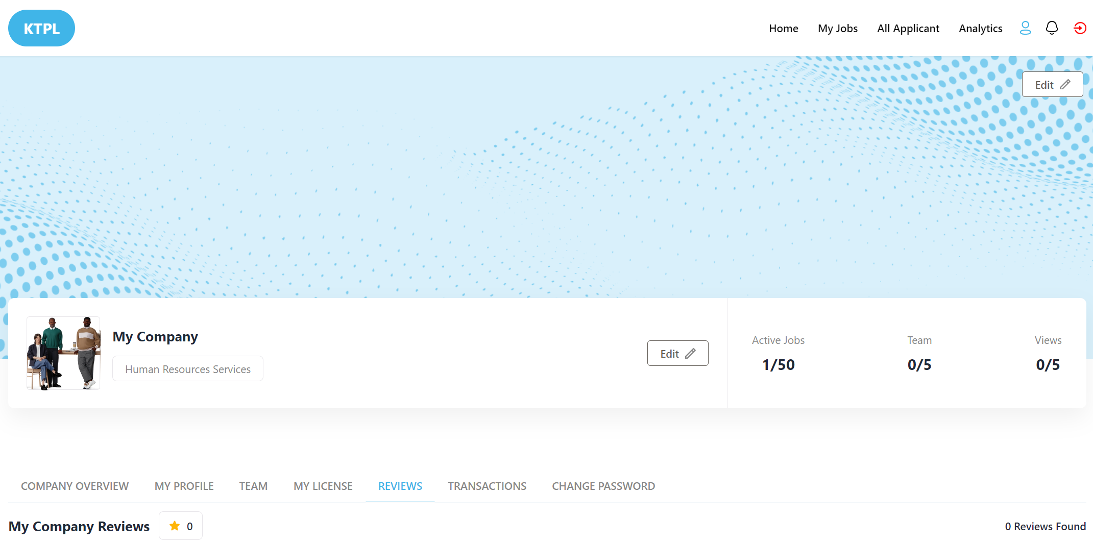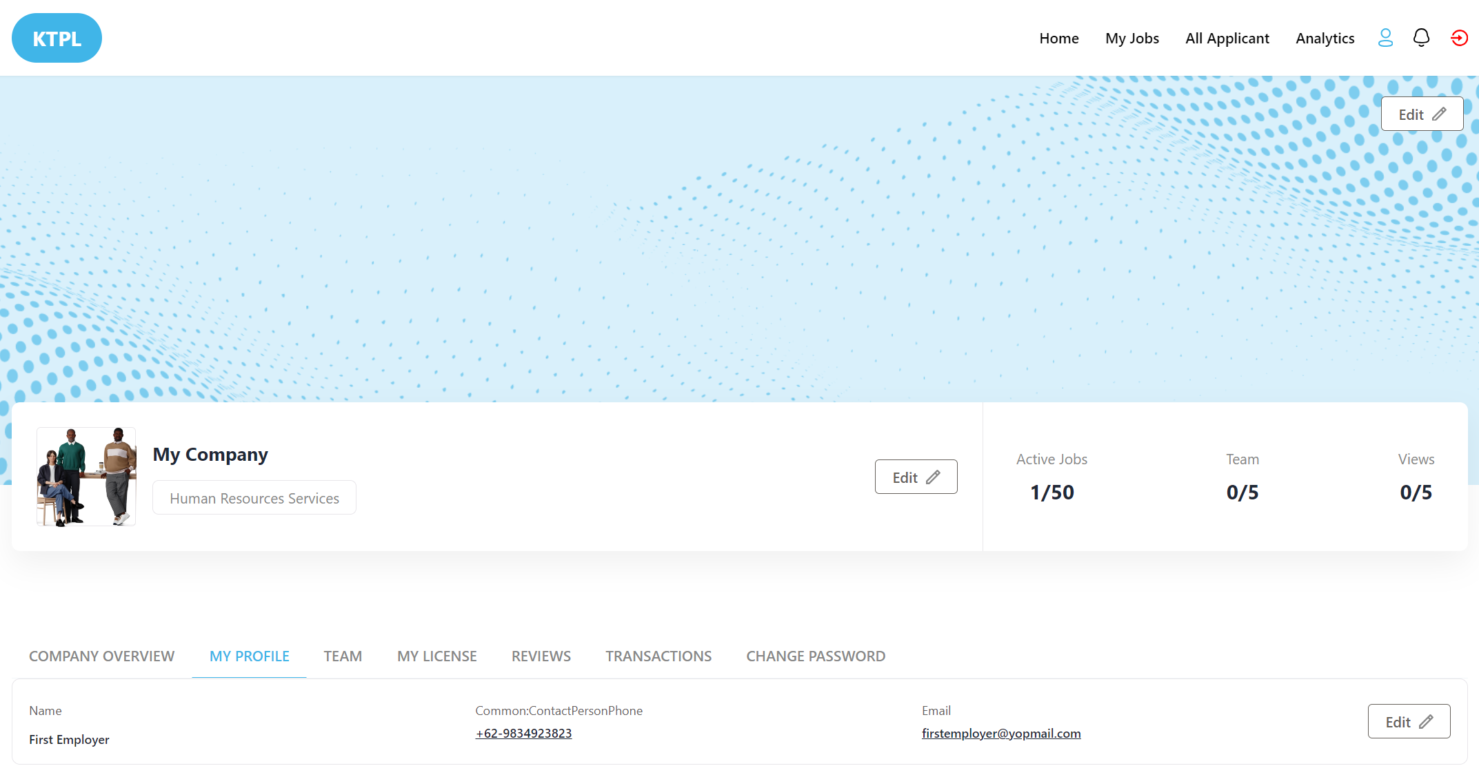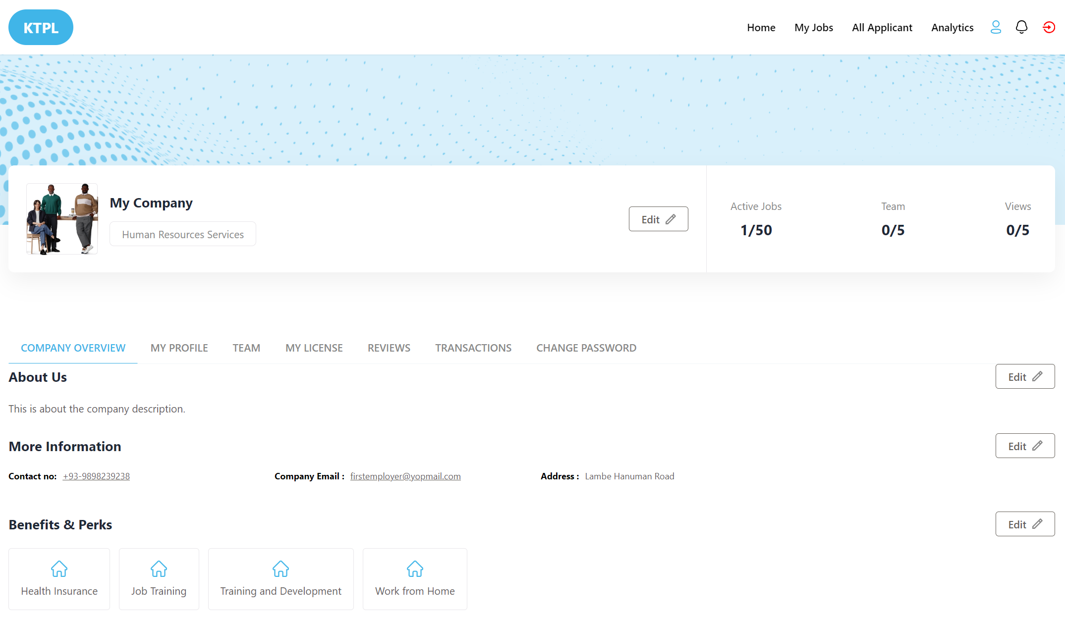 The profile page will have several tabs that will show the overall details of the company and the employer associated with that company which can be editable by you as an employer to maintain the accuracy of the details.