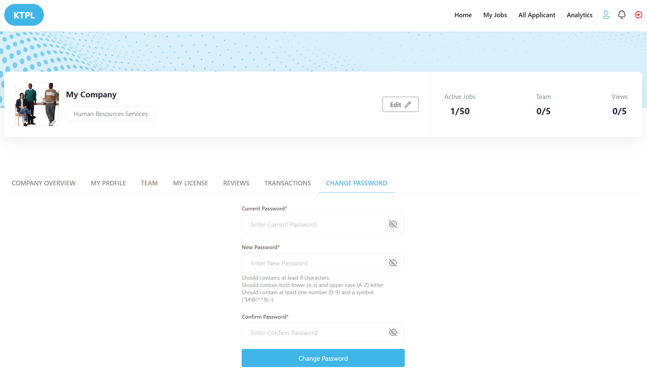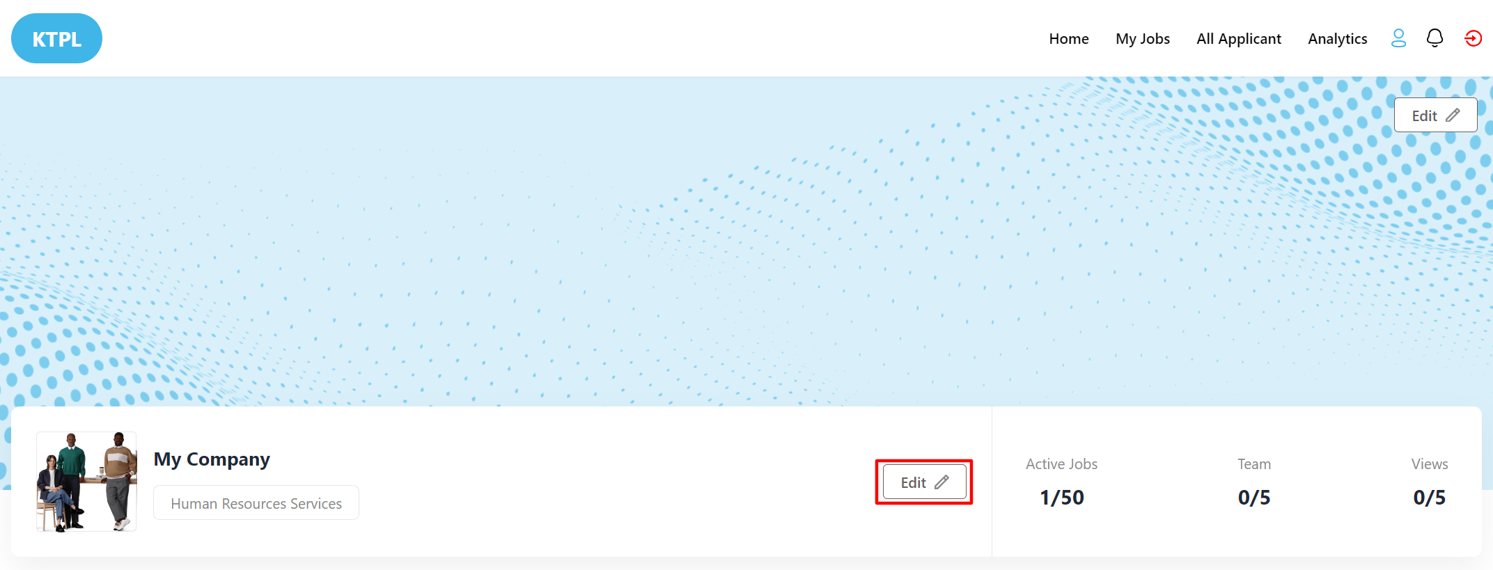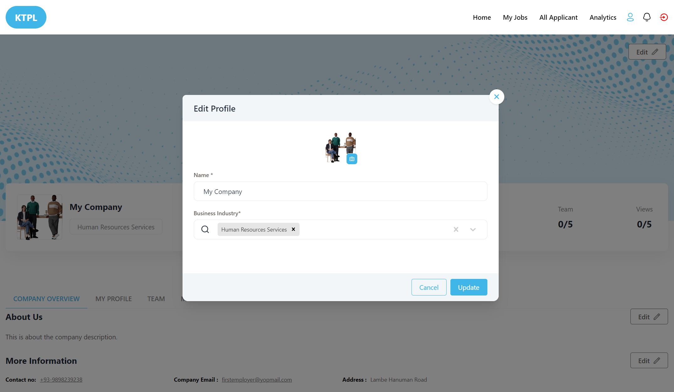 The profile page will have several tabs that will show the overall details of the company and the employer associated with that company which can be editable by you as an employer to maintain the accuracy of the details.