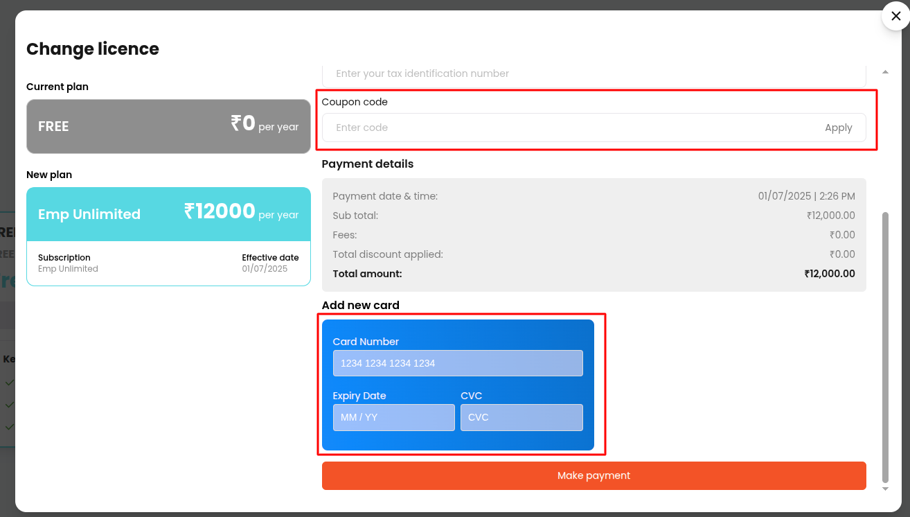7. Coupon code(Optional): When the employer enters a valid coupon code and clicks on "Apply", the respective changes in the amount will be reflected in the "Payment details" sub-section. The successful application of the coupon message is displayed. The user also has an option to remove the applied coupon, if they wish to, before making the final payment.