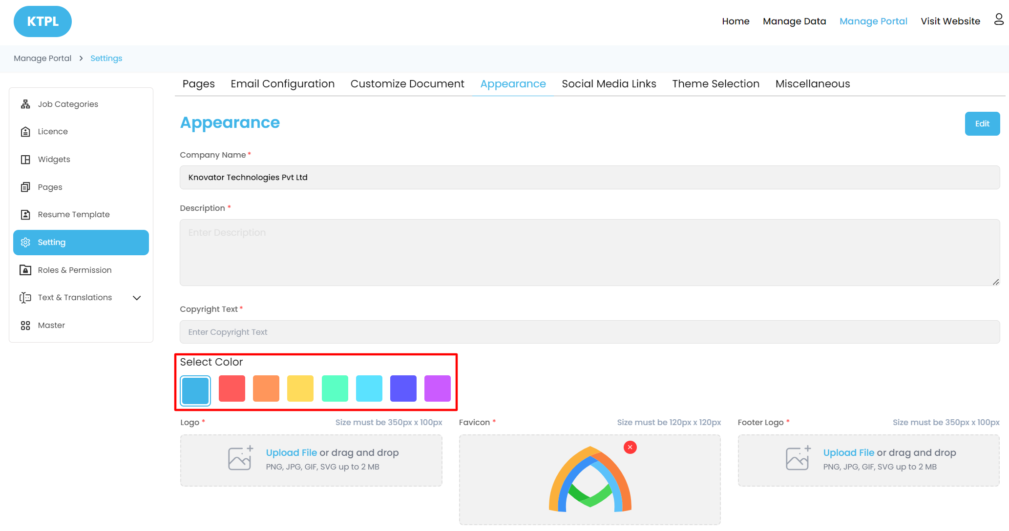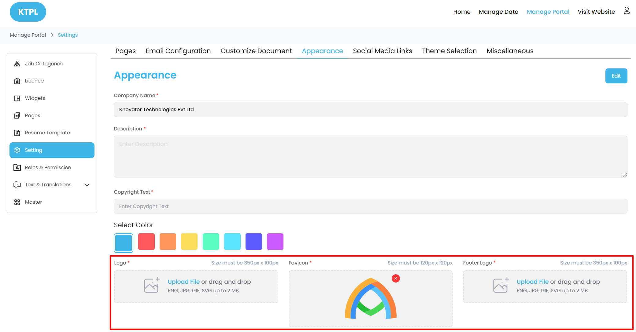 4. Select the appearance tab, click on edit, upload your logo and save.